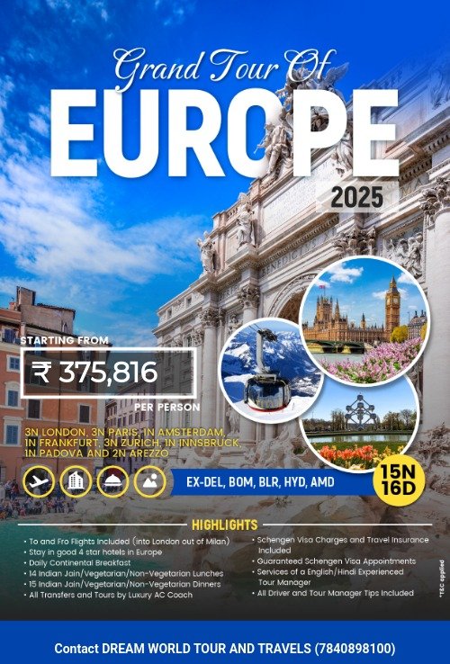 Step into the grandeur of Europe with our Grand Tour of Europe 2025 (15N/16D) – a luxurious journey through the continent’s most iconic cities and breathtaking landscapes. Designed for travelers who want to see it all, this comprehensive package covers London, Paris, Amsterdam, Frankfurt, Zurich, Innsbruck, Padova, and Arezzo, offering an unforgettable blend of history, art, culture, and natural beauty.